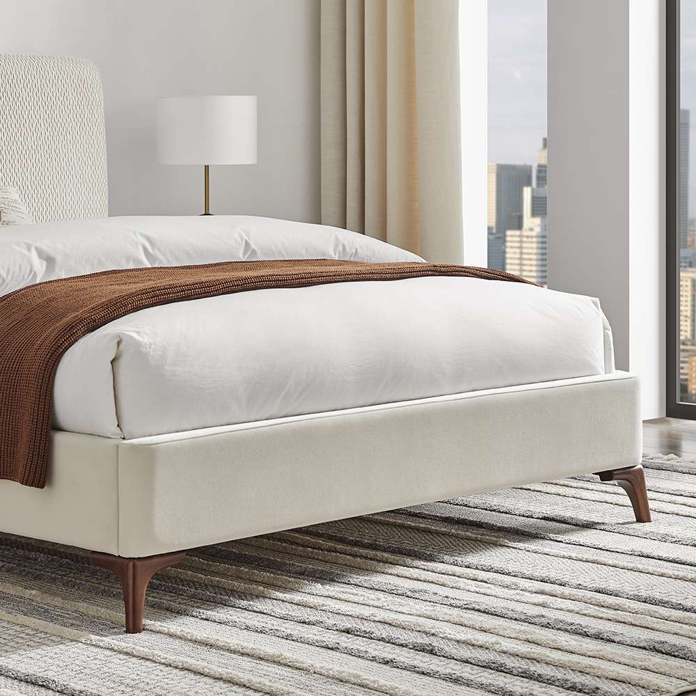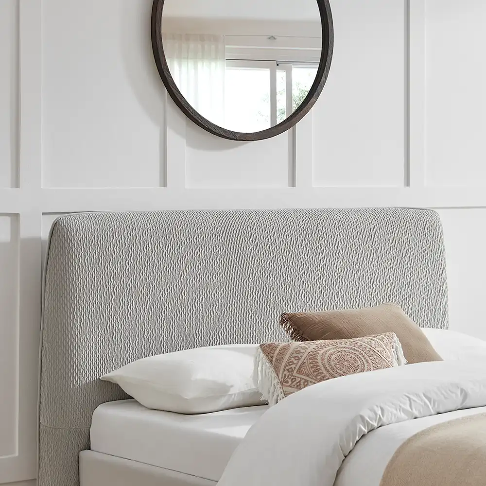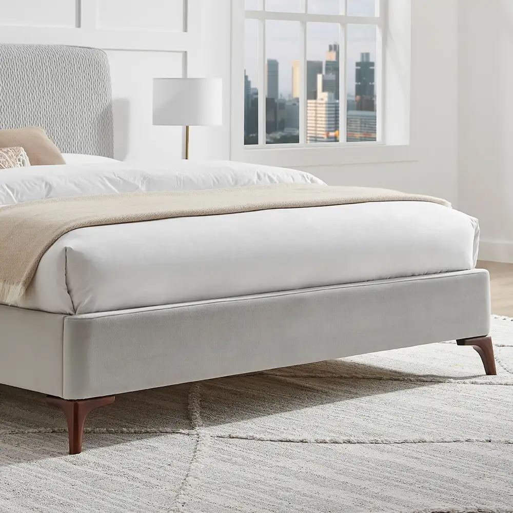 The standout feature is the beautifully detailed quilted fabric headboard, available in grey or natural tones, creating a striking focal point. This is paired with coordinating velvet side rails and footend, adding depth and a subtle touch of luxury to the overall design.