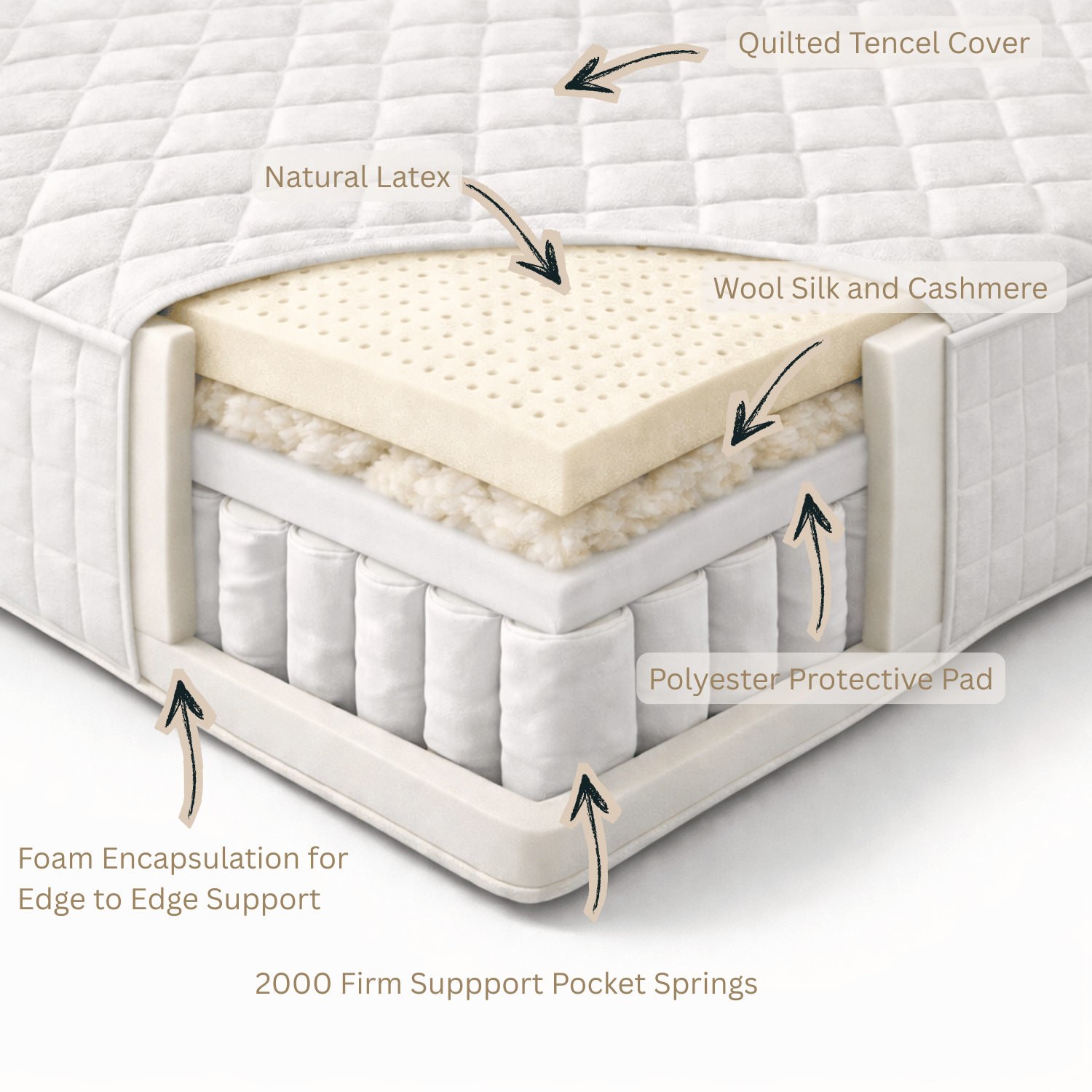A robust 2000 pocket spring core works independently to support your body, helping to reduce pressure points and limit motion transfer. Layers of wool, silk, and cashmere create a breathable, temperature-regulating comfort layer, while responsive latex adds gentle cushioning and long-lasting resilience.